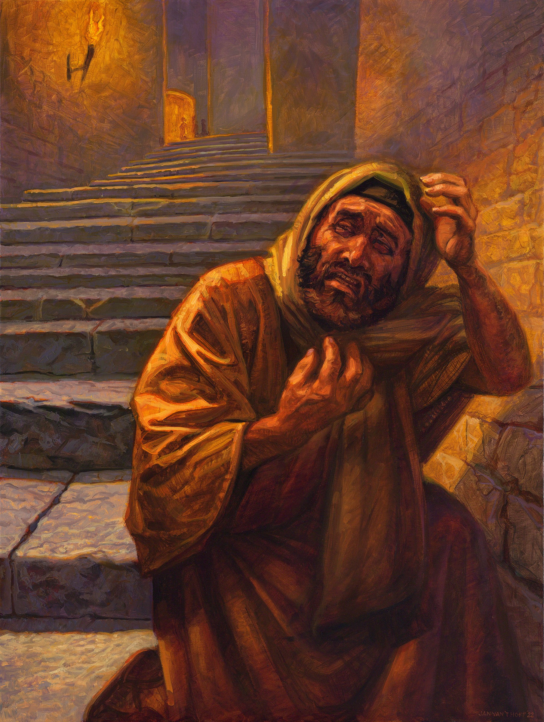 Djalli e shtyn Pjetrin të mohojë Jezusin 3 herë. Atëherë Jezusi kthehet dhe e shikon atë. Pjetri pendohet, dhe pasi del jashtë, qan me hidhërim.