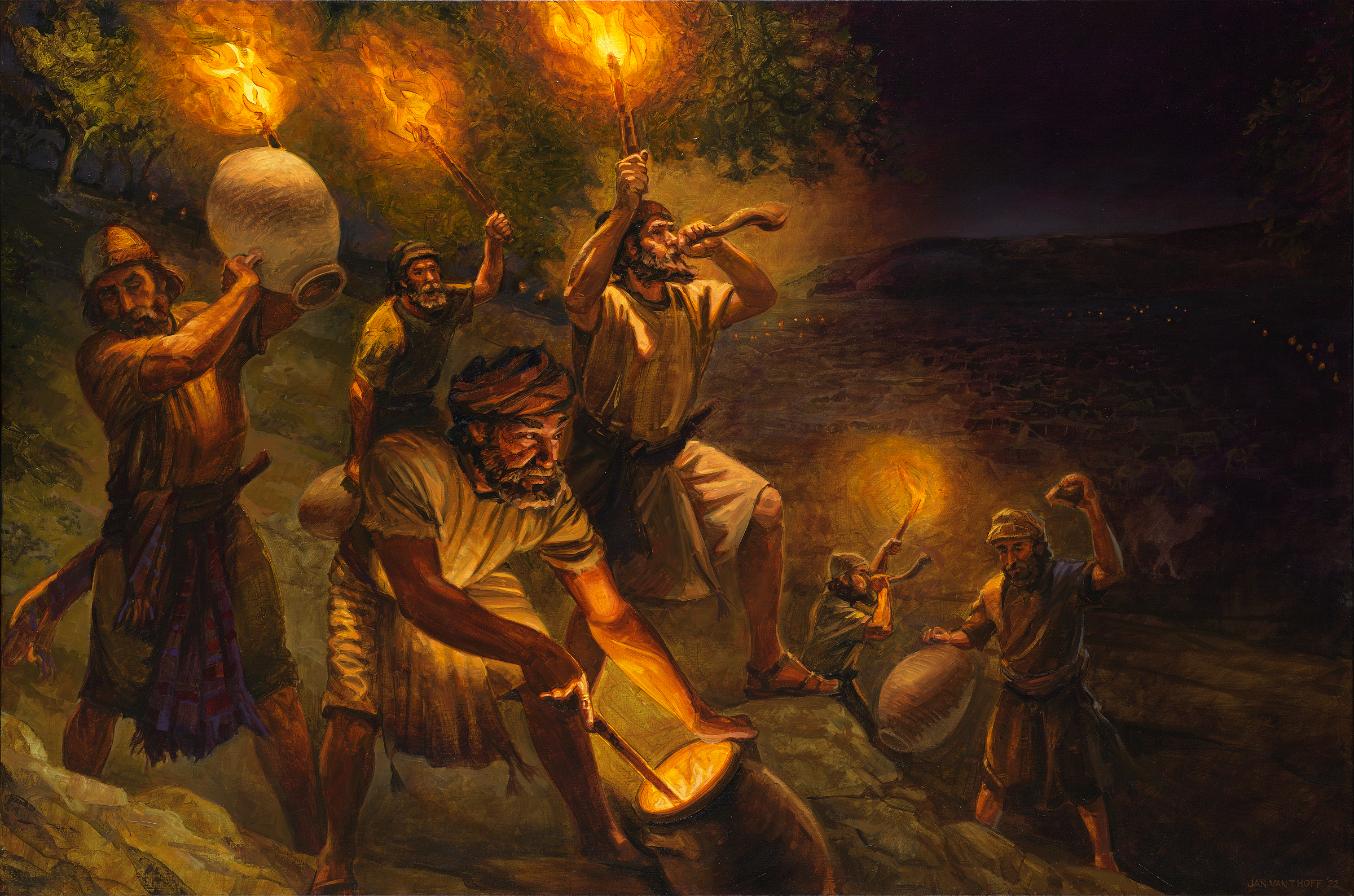 Kur burrat e Gedeonit të ndarë në tre grupe prej 100, në mesnatë, rrethojnë midianitët dhe i tmerrojnë ata me boritë dhe pishtarët e tyre, me klithmat e luftës dhe zhurmat e enëve që thyeheshin, Zoti i tmerroi aq shumë midianitët sa ata filluan të luftonin kundër njeri-tjetrit dhe të arratiseshin.