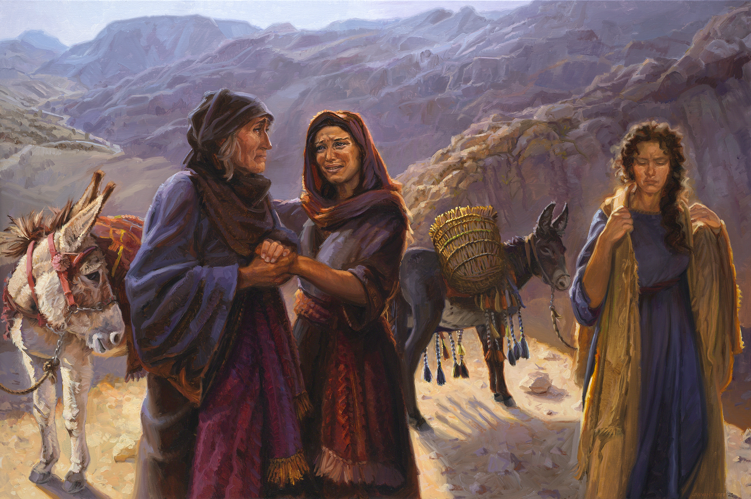 Sidoqoftë, gjatë rrugës, Naomi përpiqet të bindë Ruthin dhe Orpahën që të kthehen në Moab. Orpaha bindet nga fjalët e Naomit, por Ruthi, në mënyrë mbresëlënëse, i betohet për besnikëri Naomit dhe Zotit.