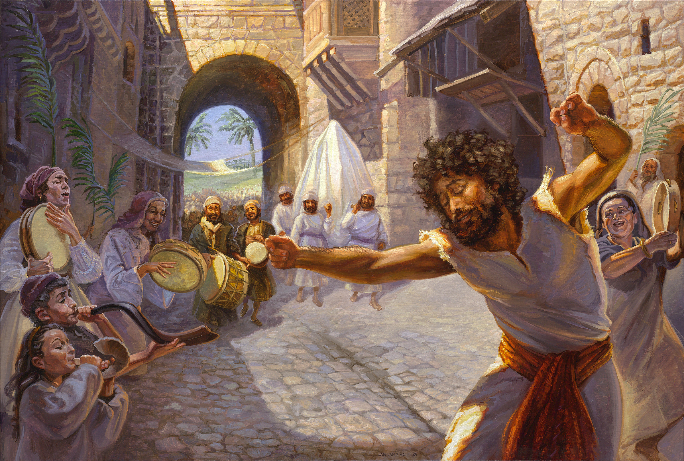 Në pikturë theksi bie mbi përjetimin e gëzuar të Davidit, në praninë e Perëndisë dhe para syve të njerëzve të thjeshtë. Shih vargu 22.