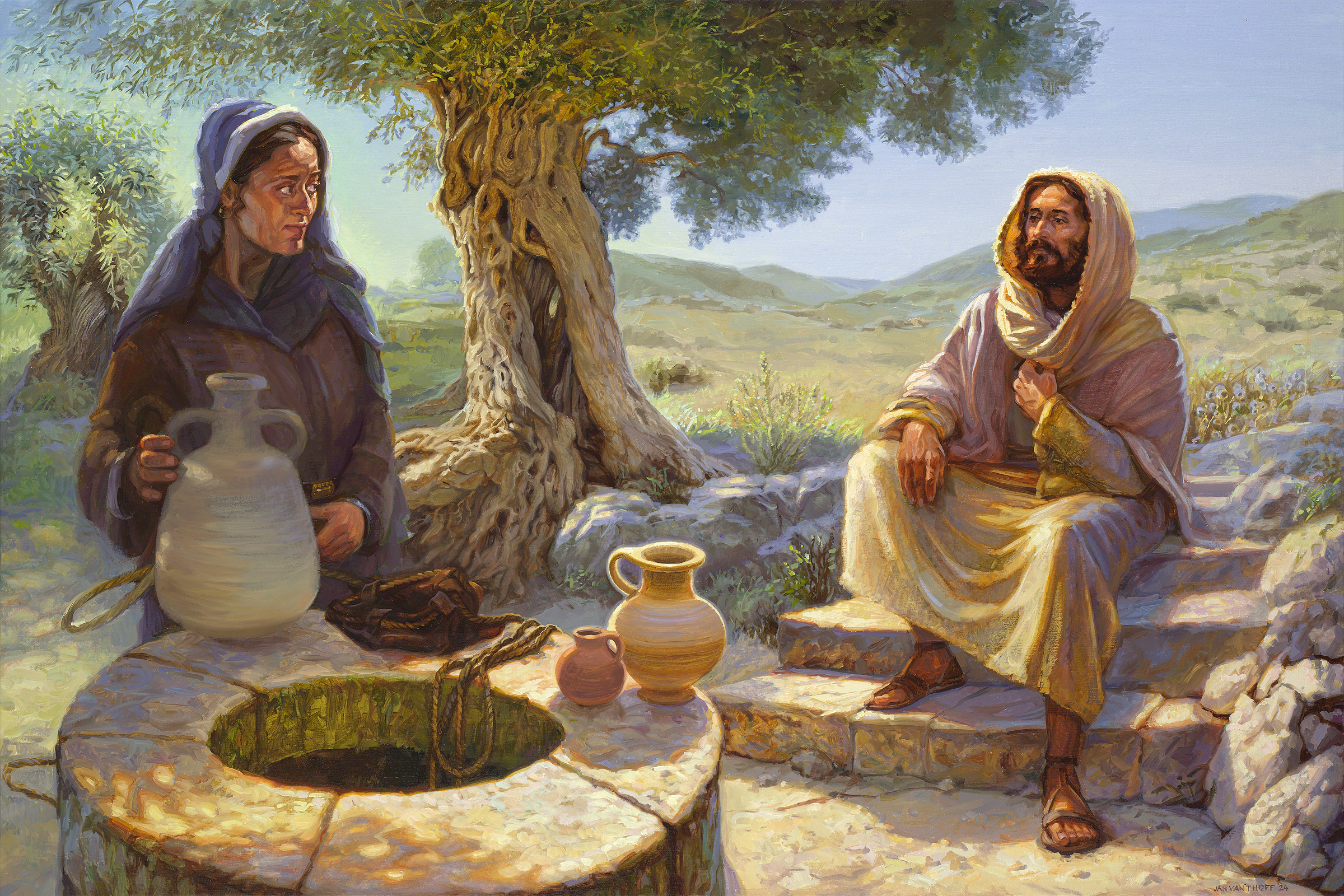 Jezusi vjen te pusi i Jakobit, afër Shekemit të lashtë, te këmbët e malit Gerizim. I drobitur, ai ulet. Është mesditë. Një grua samaritane vjen të nxjerrë ujë. Jezusi i flet asaj dhe i kërkon ujë. Gruaja habitet se një hebre, i drejtohet një gruaje samaritane (të papastër). Jezusi e ngre bisedën në një nivel shpirtëror dhe flet për ‘ujë të gjallë’, i cili e largon etjen përgjithmonë.