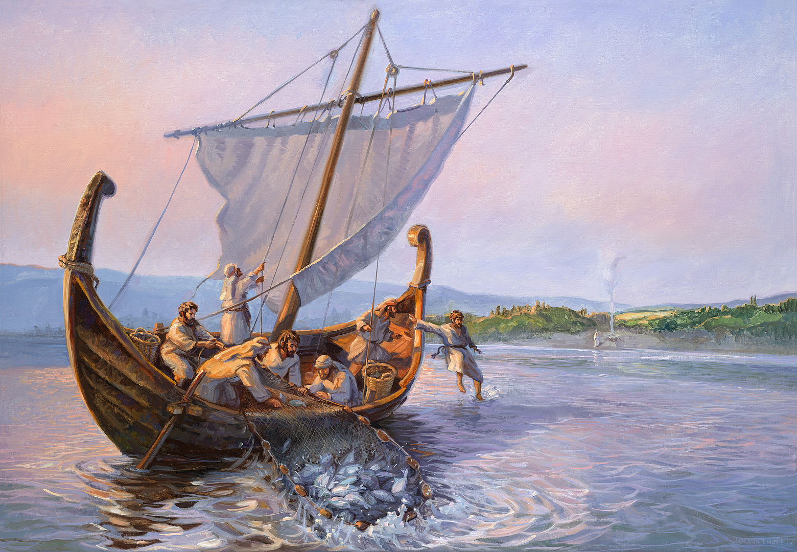 Pasi Jezusi u ngrit nga të vdekurit, Ai u shfaqet disa herë dishepujve të Tij. Në këtë rast afër detit të Tiberias. Dishepujt kanë peshkuar gjithë natën. Kur ata kthehen, Jezusi qëndron në breg dhe pyet nëse ata kanë peshq. Por ata nuk kishin kapur gjë.
