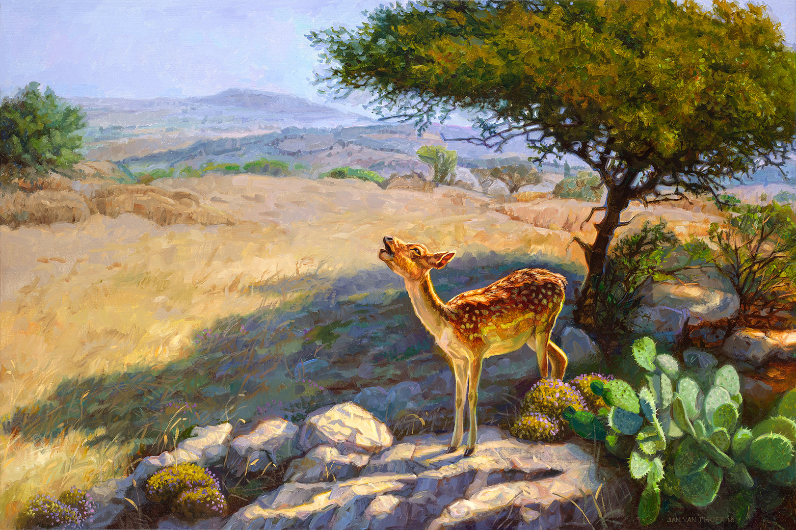 Piktura paraqet një drerë që thërret për ujë në kodrat e thata në pjesën veriore të Izraelit.