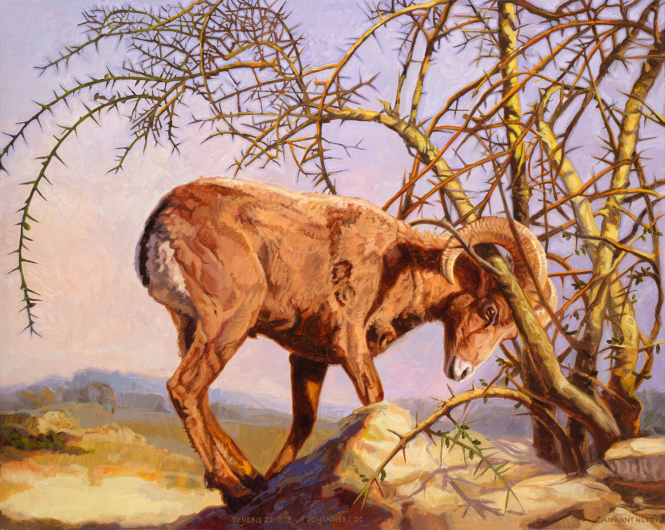 Atëherë Abrahami ngriti sytë dhe shikoi; dhe, ja, prapa tij një dash i zënë për brirësh në një kaçube. Kështu Abrahami shkoi, mori dashin e tij dhe e ofroi si holokaust në vend të të birit.Teksti i plotë i biblës