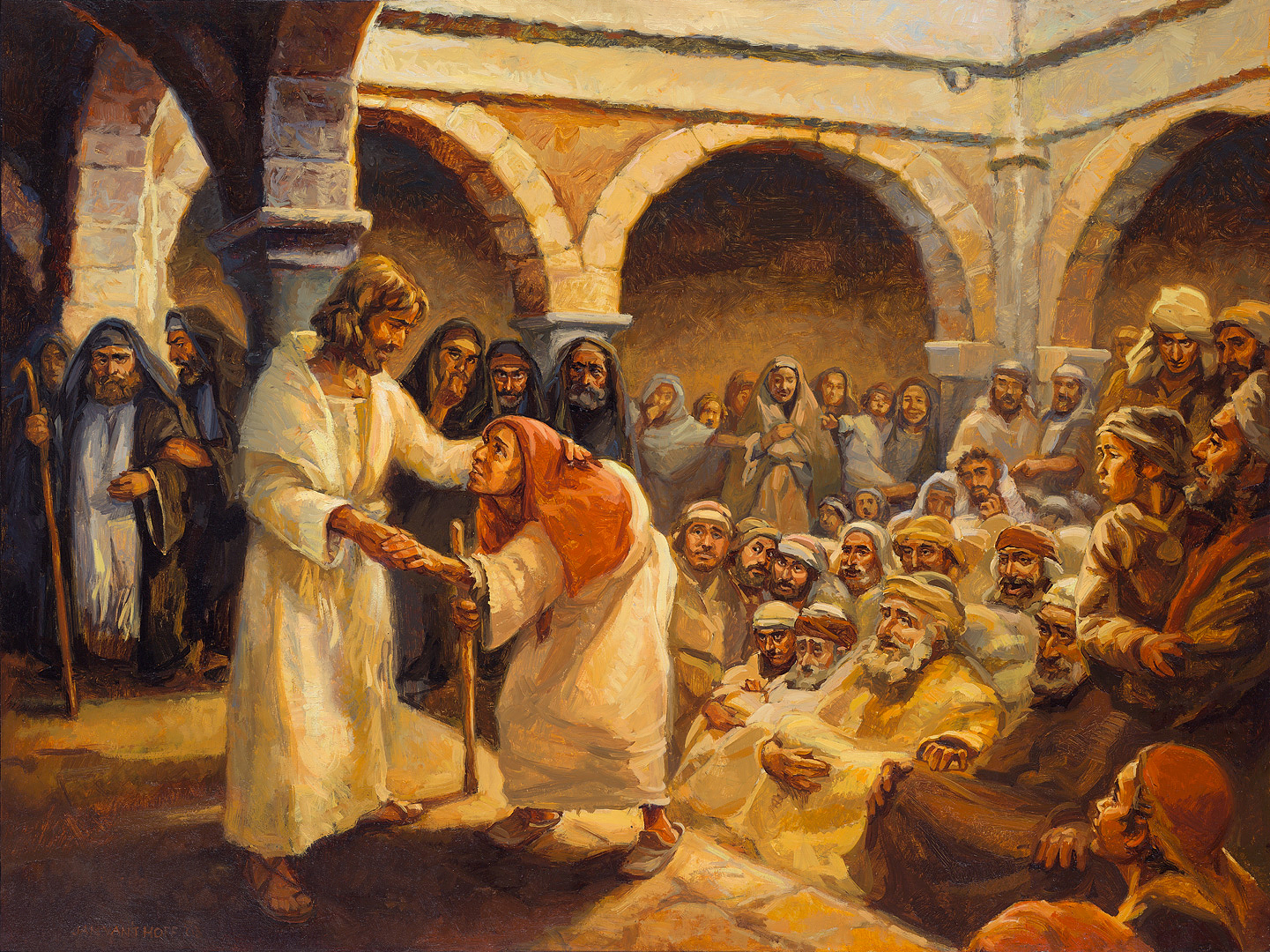 Shërimi i gruas së paralizuar në këtë pikturë ndodh në oborrin e një sinagoge.