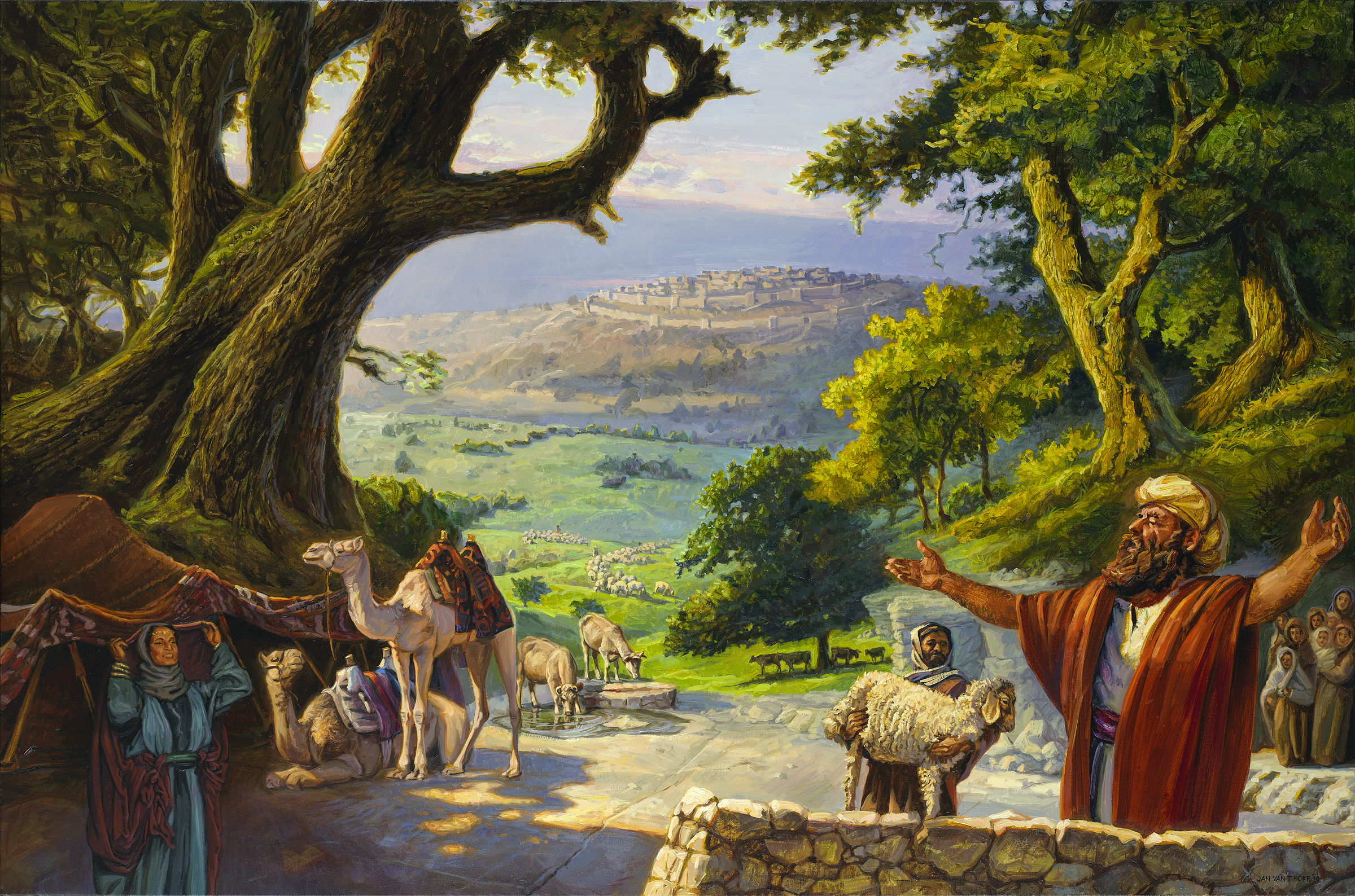 Abram niset për në Kanaani dhe mbërrin atje. Ndërsa udhëton përmes vendit ai ndërton altare për Perëndinë në disa vende; së pari në Shekhem, më pas edhe në rrethinat e Bethelit dhe Ait. Altari i tretë i përmendur në tekst ndërtohet afër pemëve të larta të Mamres në Hebron. Ky altar paraqitet në pikturë. Hebroni është i dukshëm në sfond.