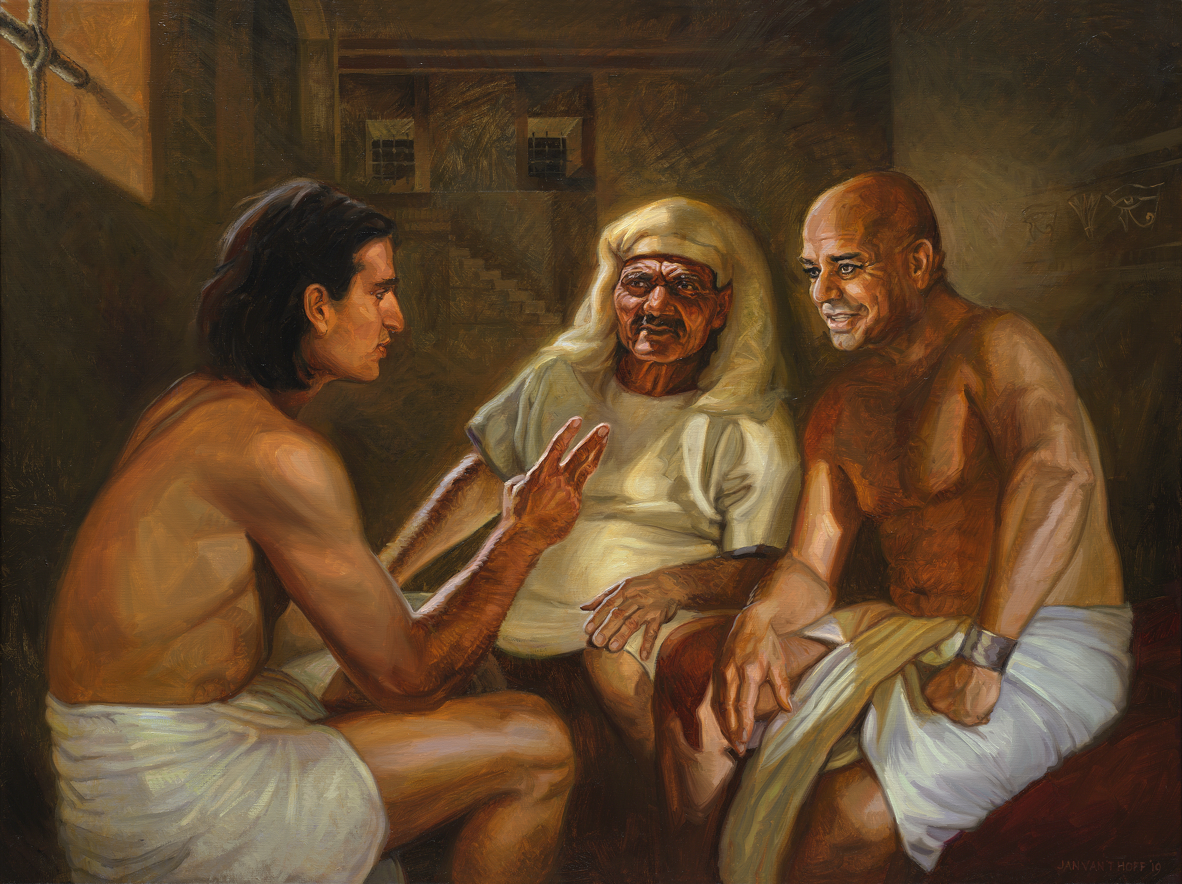Jozefi bëhet shërbëtor i tyre. Një ditë, si kupëmbajtësi dhe bukëpjekësi zgjohen pasi kanë parë ëndrra të mistershme. Jozefi ofrohet t’ua shpjegojë ëndrrat. Shpjegimi, i cili i takon Perëndisë, më vonë vërtetohet si i saktë. Pas tre ditëve, kupëmbajtësi rikthehet në detyrën e tij në oborrin e faraonit, ndërsa bukëpjekësi varet. Numri tre, i treguar nga veprimi i dorës së Jozefit në pikturë, shfaqet si thelbësor për shpjegimin.