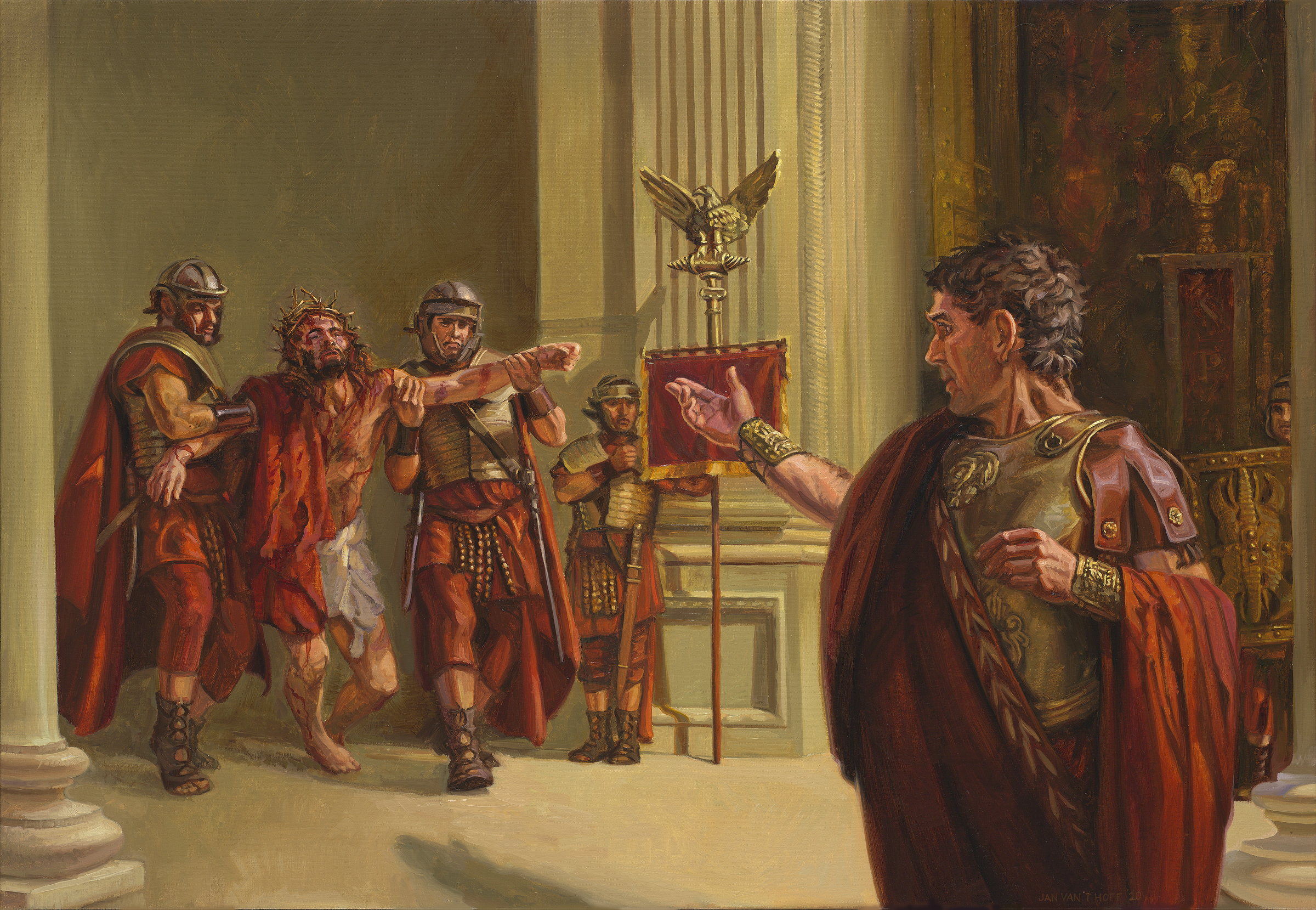 Pilati e merr në pyetje Jezusin, e gjykon se është i pafajshëm. Sidoqoftë, ai urdhëron që ta fshikullojnë. Pas fshikullimit, Pilati e nxjerr jashtë Jezusin dhe i drejtohet turmës: “ Ja njeriu!”.