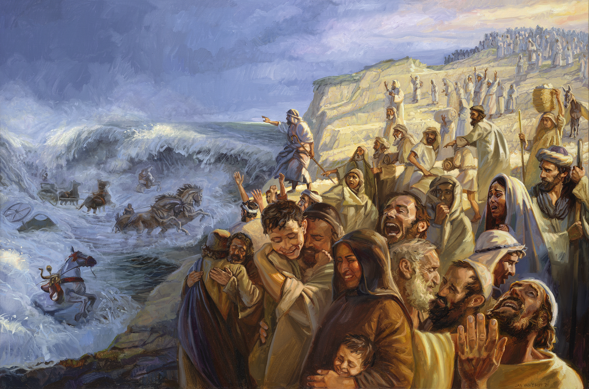 Pas 10 plagëve, që Zoti solli mbi Egjiptin, Faraoni më në fund i lë të shkojnë njerëzit e Tij. Pak më pas ai pendohet dhe vendos prapëseprapë t’i ndjekë ata. Izraelitët janë në hall; deti ndërpret rrugën e tyre para, ushtria egjiptase po i ndjek nga pas. Prania shpëtuese e Perëndisë shfaqet kur Engjëlli i Zotit qëndron mes tyre në një shtyllë reje, kështu që egjiptasit nuk mund t’u afrohen popullit të Izraelit. Moisiu duhet ta ngrejë shkopin e tij dhe të shtrijë dorën drejt detit dhe ta ndajë atë. Atëherë Zoti e kthen pas detin nëpërmjet një ere të fortë lindore dhe e bën të thatë tokën e detit. Populli shkon në mes të detit në tokën e thatë.