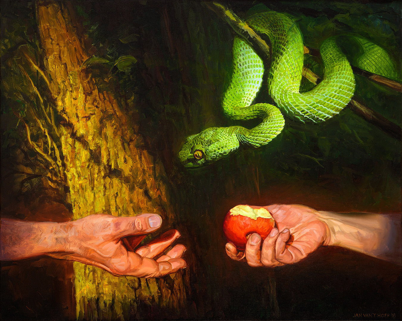 Djalli (duke folur përmes gjarprit), e joshi Evën që të hante frutën e ndaluar, duke e bërë atë të dyshonte moslejimin e Perëndisë. ‘Kur të hash frutën e ndaluar do të bëhesh si Perëndia’ – ishte mesazhi i tij.