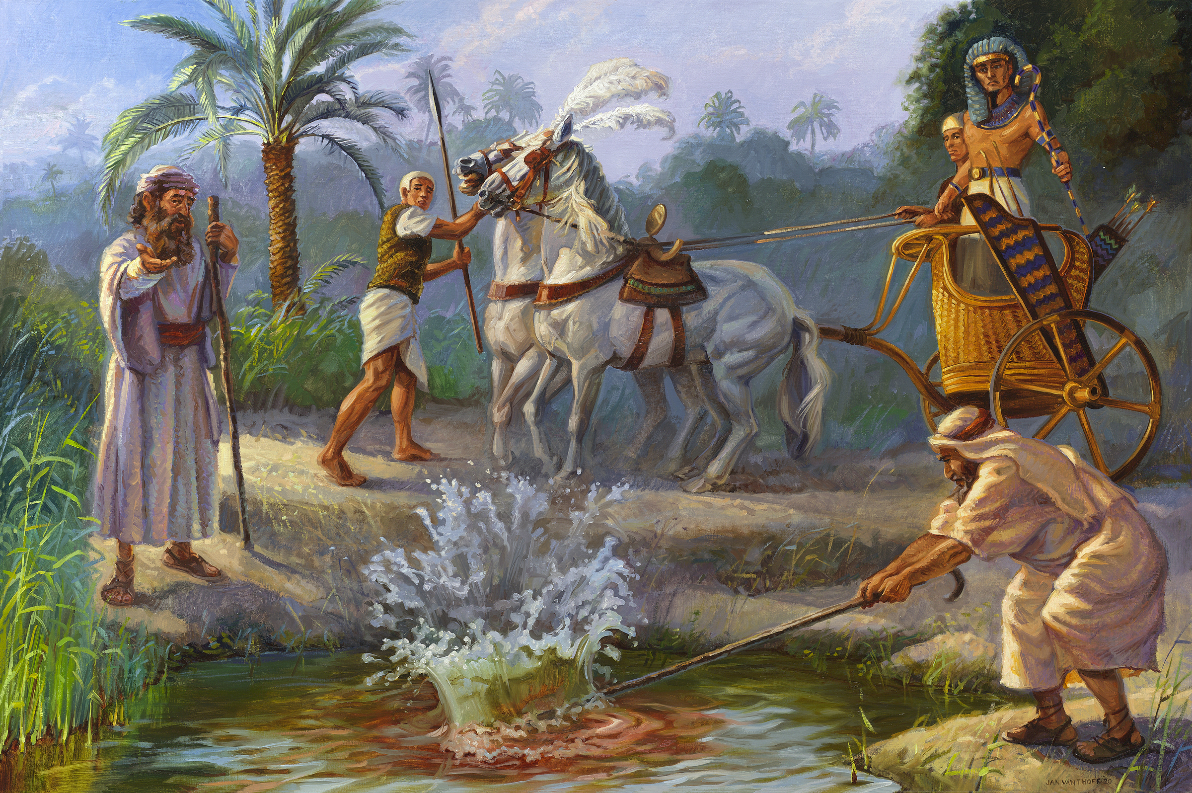 Përpara syve të faraonit, Moisiu (ose Aaroni) godet ujin me stafin që më parë ishte shndërruar në gjarpër, dhe burimi i ujit të Egjiptit kthehet në gjak, kështu që peshqit ngordhin dhe një erë vdekje ngrihet. Magjistarët e faraonit nuk mund ta shndërrojnë gjakun në ujë sërish, por duket se janë në gjendje të kthejnë ujin në gjak edhe ata, kështu që faraoni i qëndron refuzimit të tij. Ai e ngurtëson zemrën e tij dhe vendos të mos pranojë Perëndinë.