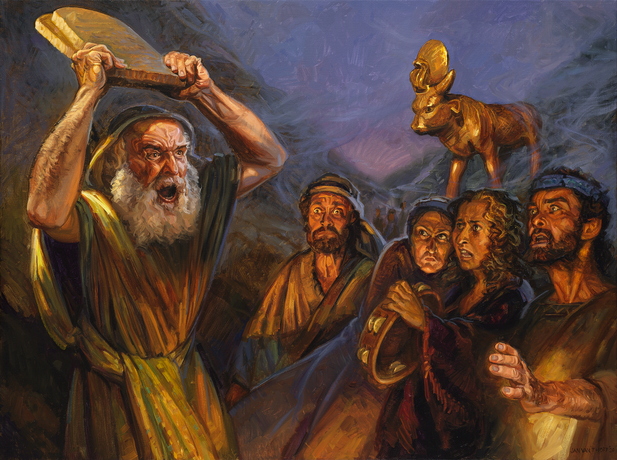 Megjithatë, kjo është kundër vullnetit të Perëndisë. Mbi mal, Ai i flet Moisiut, dhe e urdhëron atë që të zbresë, sepse ‘populli e ka korruptuar vetveten’. Kur Moisiu zbret dhe sheh adhurimin e viçit të artë, ai ‘u ndez nga zemërimi dhe ai i hodhi pllakat nga duart e tij dhe i theu në këmbët e malit’.