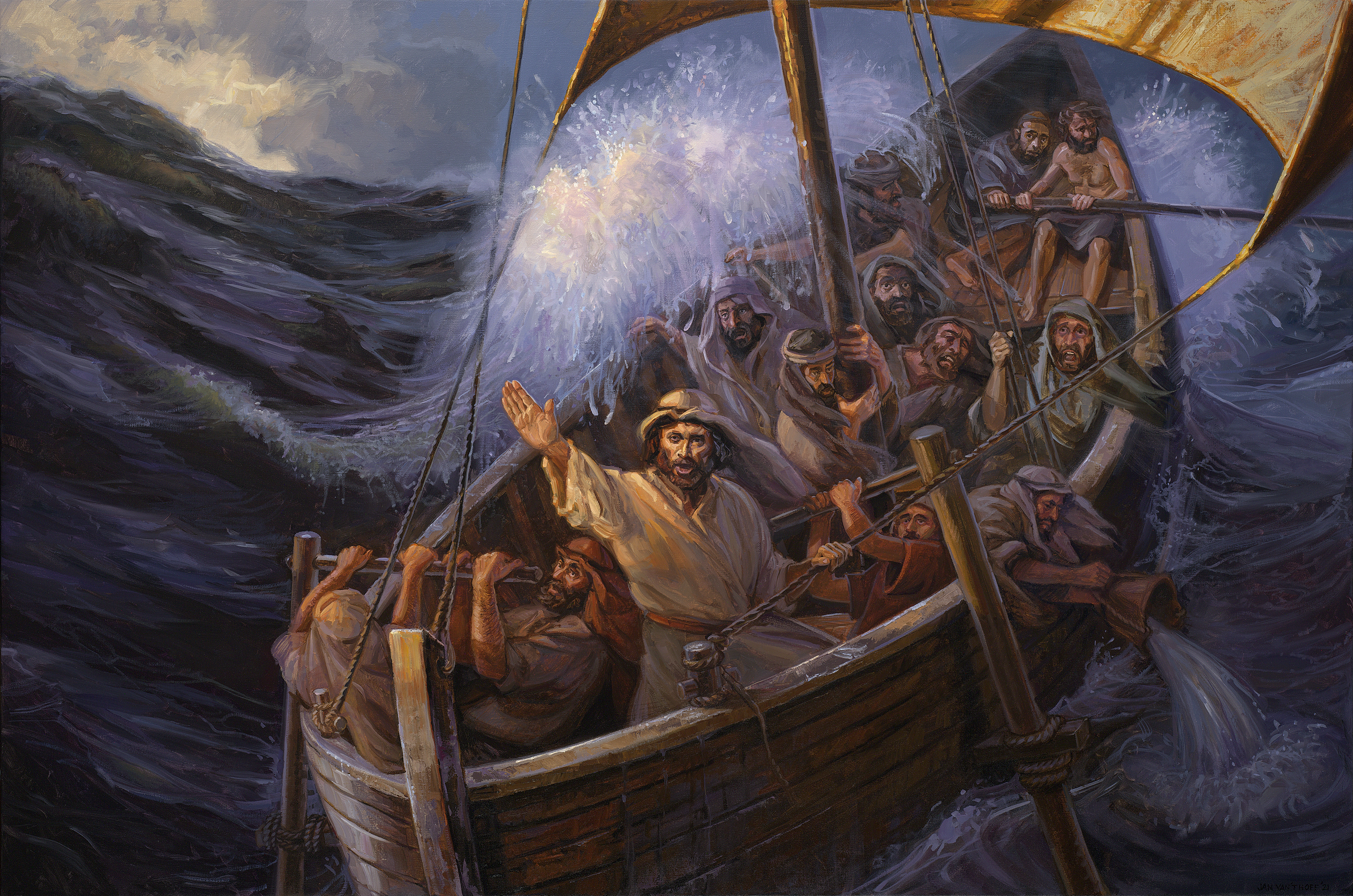 Pastaj një stuhi e madhe ngrihet. Atëherë, dishepujt, të cilët ishin peshkatarë nga profesioni dhe njiheshin me situatën e liqenit, nuk mund ta ndalonin mbytjen e anijes. Në trazimin e tyre ata zgjojnë Jezusin duke thirrur: “O Zot, na shpëto, po humbasim!”. Në ankthin e tyre, sidoqoftë, ata kuptojnë se Ai mund t’i ndihmojë. Duke u zgjuar, Jezusi i pyet ata se pse janë kaq të shqetësuar. “Ku është besimi juaj?”. Luka 8:25.